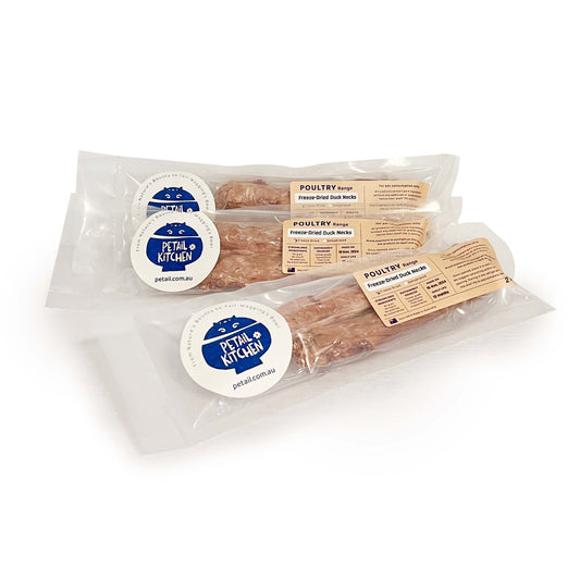 Regular price From $7.00Regular priceUnit price / perSale price From $7.00Petail Kitchen's Freeze-Dried Duck Necks are a healthy, natural, and delicious treat for dogs of all sizes. Theyโll love chewing on the flavorful bones and connective tissues, making snack time both fun and beneficial.