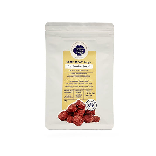 Regular price From $18.80Regular priceUnit price / perSale price From $18.80Our premium freeze-dried emu meat is made from 100% Australian ingredients, sourced directly from local farms that supply human-grade quality. This ensures freshness and health benefits for your pets. Emu meat is a very lean red muscle meat, known for its low calorie, low cholesterol, and low-fat content. It is also high in protein, iron, calcium, zinc, and selenium. The freeze-drying process helps to retain these valuable nutrients, making it an excellent choice for a healthy and nutritious treat.