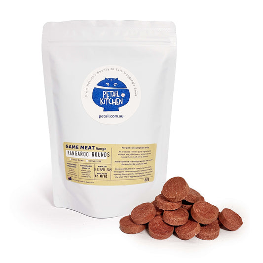 Regular price From $18.00Regular priceUnit price / perSale price From $18.00Petail Kitchen's Premium Freeze-Dried Kangaroo Rounds is made from 100% pure kangaroo meat. Preservative-free and naturally low in fat, our kangaroo meat is responsibly and ethically sourced from certified farms across Australia. Using advanced freeze-drying technology, we retain maximum nutritional value while ensuring long shelf life at room temperature with no added ingredients.